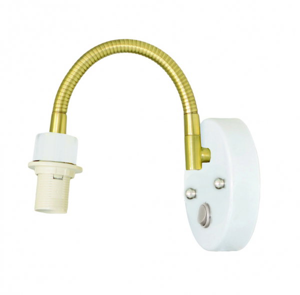 En vacker vägglampa med en flexarm i borstad mässingsfärgad metall och stomme i vit metall. Har en E14-sockel och matchas med toppringskärmar som har ett E14-toppringsfäste.