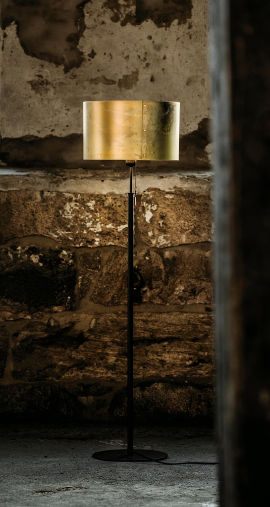 Svep Golvlampa Rå Mässing från Konsthantverk Tyringe. Ett otroligt utförande av en skärm i rå mässing på både insidan och utsidan som är kombinerad med en enkel och stilren lampfot i mattsvart metall.