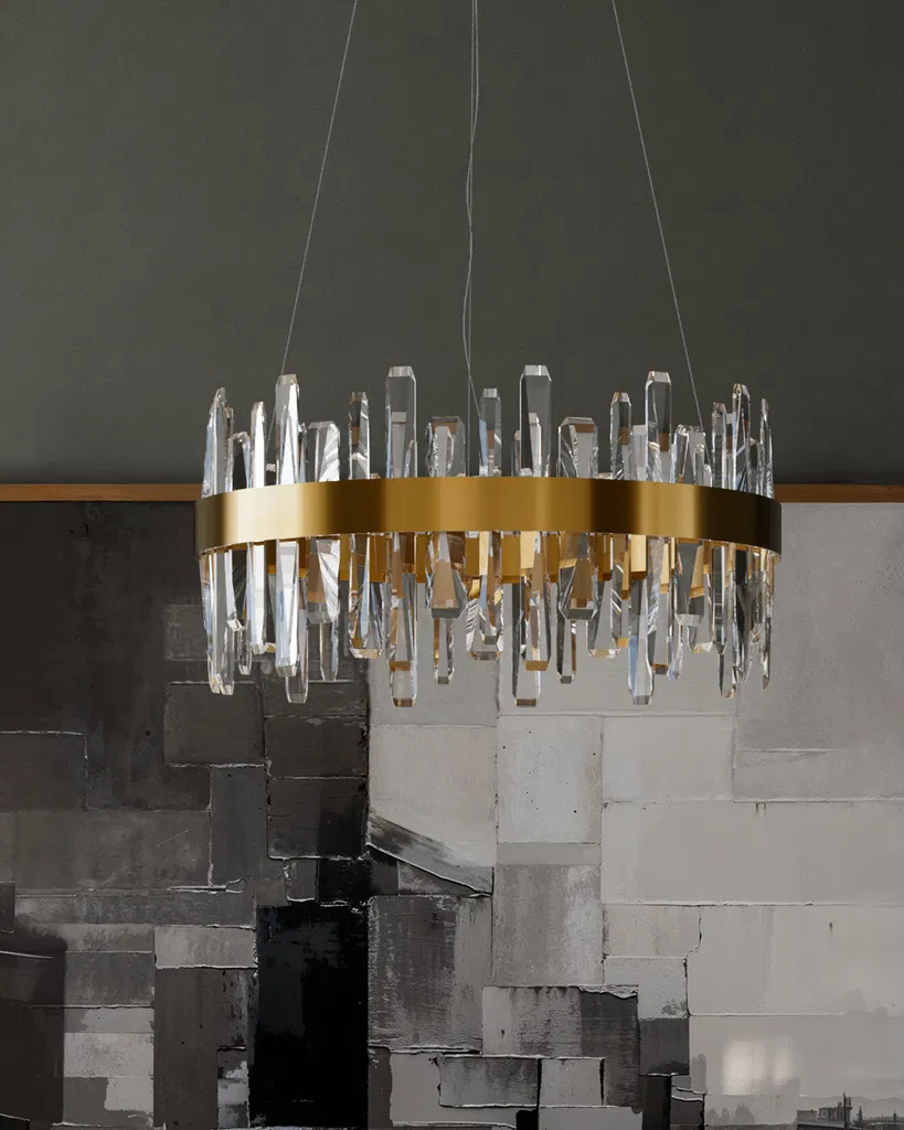 Triumph är en exklusiv och elegant taklampa som kombinerar dekorativa glasstavar i tre olika storlekar med vackra detaljer i mässing. Den är ett riktigt blickfång och ger rummet en lyxig känsla, perfekt för dig som vill lyfta inredningen med något unikt och smakfullt.