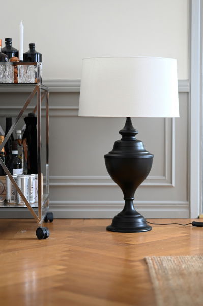 En elegant bordsarmatur i mattsvart metall med en design som en trofé. Mått: 63cm i höjd - 24cm i diameter. Kommer med E27-sockel max 40W, 1,5m sladd med brytare och stickkontakt.