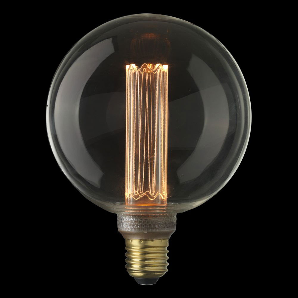 En dekorativ större globlampa med 125mm i diameter med E27-sockel med mycket varmt ljus likt en koltrådslampa. Färgtemperatur 1800K, 120 lumen, ger ett extra varmvitt sken. Är dimmerkompatibel.