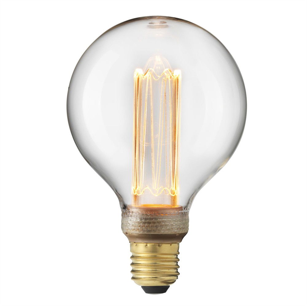 En dekorativ globlampa med 95mm i diameter med E27-sockel och med mycket varmt ljus likt en koltrådslampa. Färgtemperatur 1800K, 80 lumen, ger ett extra varmvitt sken. Är dimmerkompatibel. Har hög färgåtergivning CRI90+.