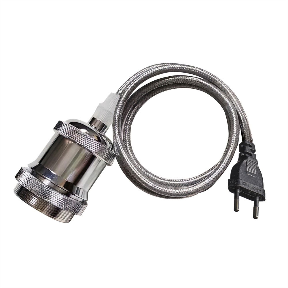 Skapa din egna fönsterlampa/taklampa. Har ett silver fäste. En silvrig textilkabel med väggkontakt för vägguttag. Kommer med E27-sockel max 60W.