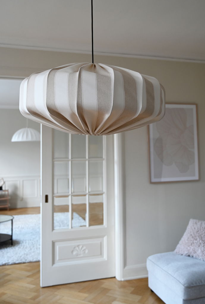 Saint Tropez är tillverkad i ett sandfärgat linnetyg med ljusa och mörkare ränder. Välj mellan två olika storlekar, samtliga har ett E27-ringfäste.