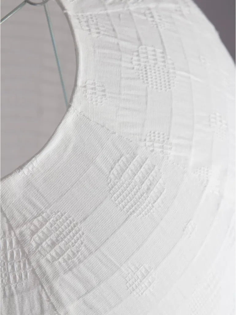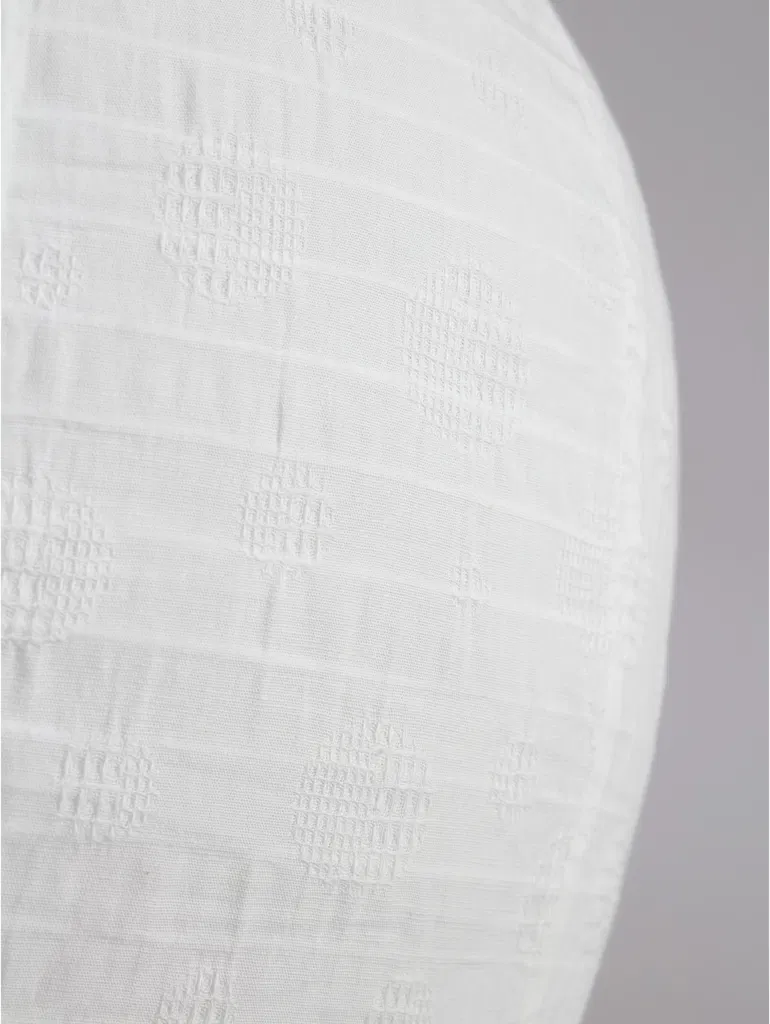 En vacker och unik taklampa i en bred "droppform" som är tillverkad i vitt bomullstyg med en subtil vävd struktur, ger ett tidlöst utseende som skapar en mjuk och elegant atmosfär i alla rum.