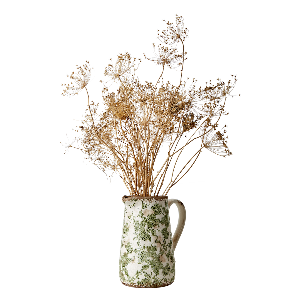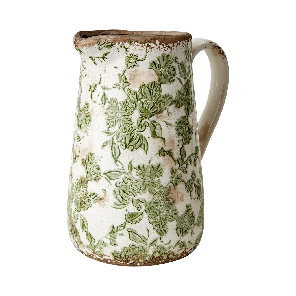En vacker kanna i sten med en vit bakgrund och ett grönt blad motiv. Victoria gör sig fin på middagsbordet med vatten i men även som en inredningsdekoration som den är eller med blommor och växter i.