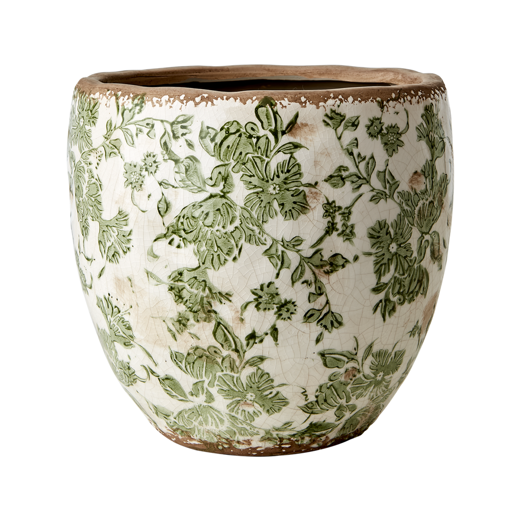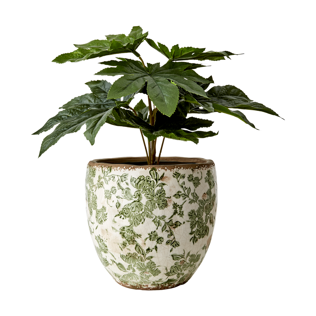 En vacker kruka i sten med en vit bakgrund och ett grönt blad motiv. Victoria är vattentät och gör sig fin inomhus som utomhus. Låt den bli en del av inredningen som den är eller matcha med växter och blommor.