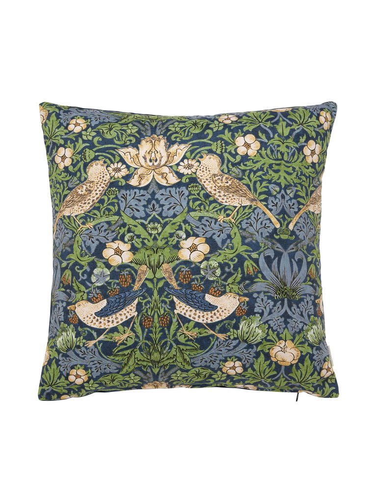 Ett kuddfodral i bomull med det vackra William Morris tyget i en blå färg. Har en matchande baksida i sammet. Går i samma tyg som "Vilja lampskärmar"