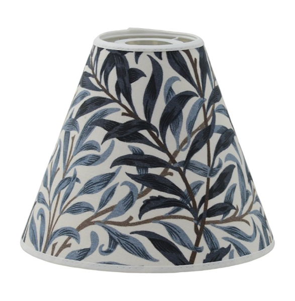 Är klädd i ett av William Morris tyger som heter Willow Bough och kommer i färgen "Midnight". Har ett E27 toppringfäste som är anpassad för golvlampor och vägglampor med böjd arm.