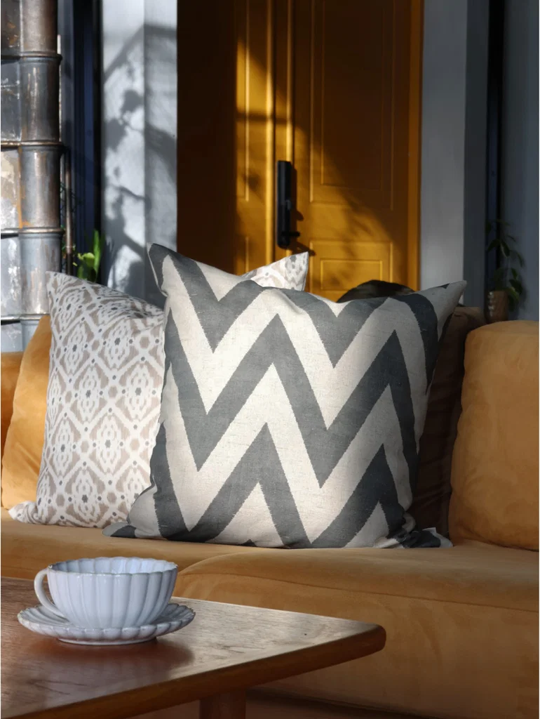 Kuddfodralet är i mönstret Zac - är ett organiskt, textilt mönster i naturlig skandinavisk stil, som blir en vacker och levande detalj till inredningen.